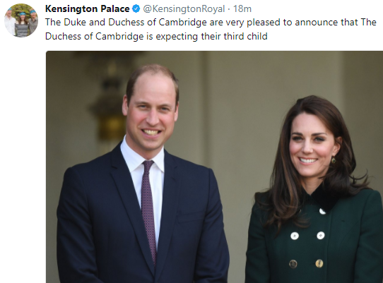 The Kensington Palace made the announcement via twitter a few hours back. Kate and Williams already have two kids.